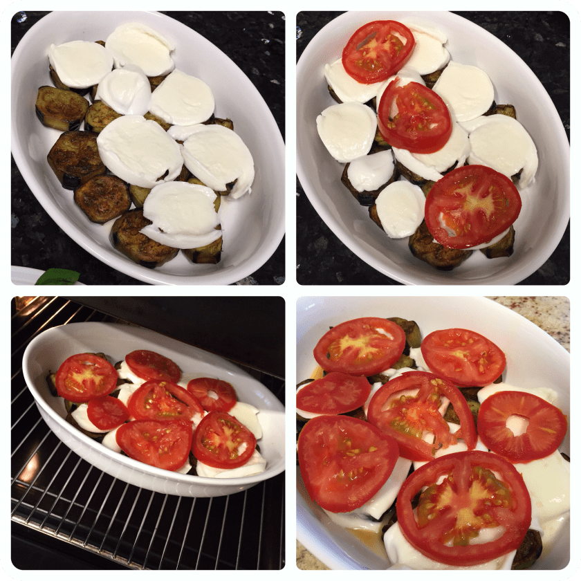 Tüm malzemeleri bir fırın kabına diziyoruz. Önce patlıcanlar, üzerine mozzarella ve en üste domatesler.